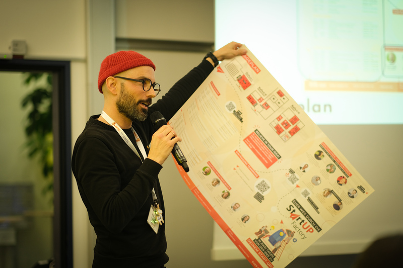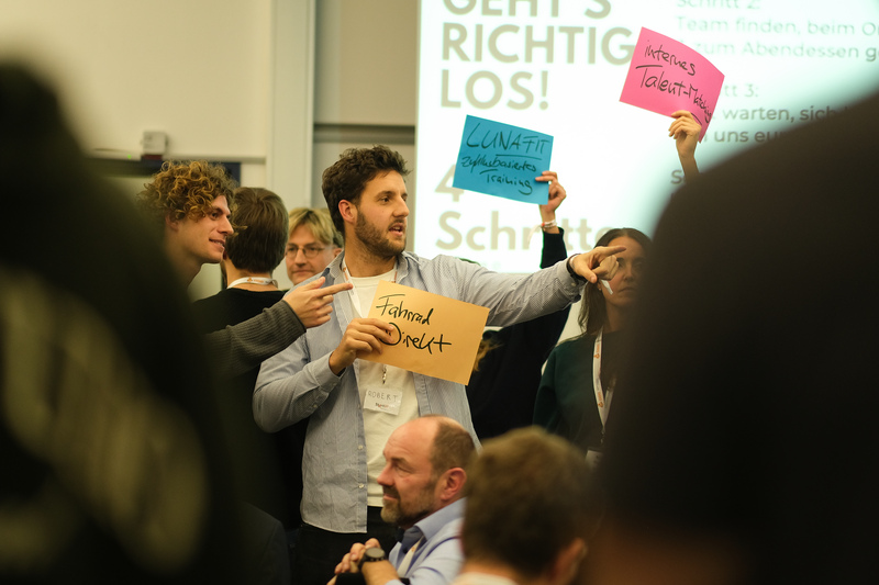 Der Start am Donnerstag war intensiv: Jeder Teilnehmende hatte genau eine Minute, um seine Idee zu pitchen. Aus den 25 Vorschlägen wurden 10 Teams gebildet, die sich von Donnerstag bis Samstag voller Energie an die Konzeption & Konkretisierung ihrer “Start-ups” gemacht haben.