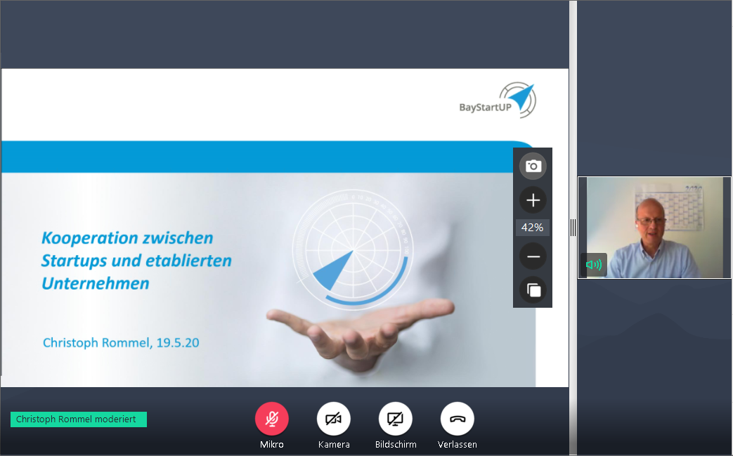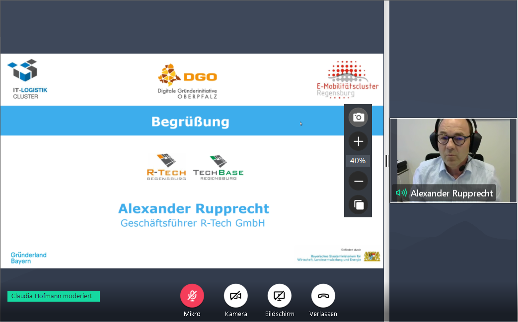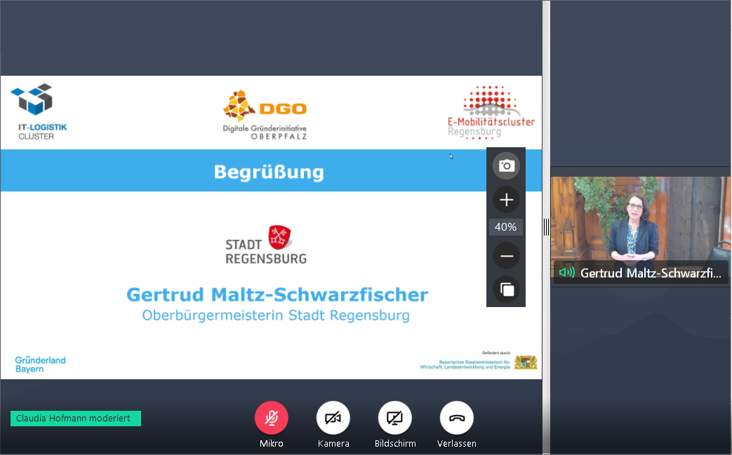 Nach der offiziellen Eröffnung des Online-Events durch die Moderatorin Dr. Veronika Fetzer, Projektleiterin der DGO, begrüßte die Oberbürgermeisterin der Stadt Regensburg, Gertrud Maltz-Schwarzfischer, die rund 110 Teilnehmer, die sich virtuell eingeschaltet hatten. Alexander Rupprecht betonte in seiner Begrüßung die Neuartigkeit des Formats sowie dessen Reichweite, die sich weit über Regensburg hinaus bis München, Linz und Kassel erstreckte und dort interessierte Start-ups erreichte. Christoph Rommel, Leiter Industriekooperationen bei BayStartUP, stimmte das Plenum im Anschluss auf wichtige Voraussetzungen einer gelungenen Kooperation zwischen Start-ups und etablierten Unternehmen ein.
