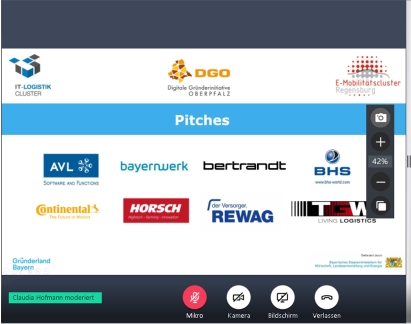 Acht etablierte Unternehmen aus der Region (AVL Software and Functions GmbH, Bayernwerk Netz GmbH, Bertrandt Technologie GmbH, BHS Corrugated Maschinen- und Anlagenbau GmbH, Continental Automotive GmbH, HORSCH Maschinen GmbH, REWAG Regensburger Energie- und Wasserversorgung AG & Co KG und TGW Software Services GmbH) pitchten im Anschluss ihre konkreten Aufgaben- bzw. Problemstellungen, die in Kooperation mit einem Start-up gelöst werden sollen. Die Themen reichten dabei von Künstlicher Intelligenz über Big Data bis hin zu Automotive und Internet of Things. Alle Teilnehmer*innen der Veranstaltung konnten währenddessen über die Chatfunktion Fragen stellen, die live von den jeweiligen Ansprechpartnern des Unternehmens beantwortet wurden. Die noch offenen Fragen wurden im Nachgang beantwortet. Die Questions & Answers wurden hier gesammelt.