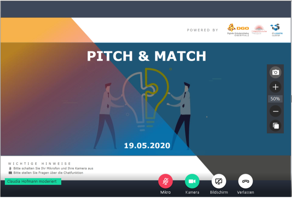 Beim digitalen Event Pitch & Match haben sich gestern Top-Entscheider aus etablierten Unternehmen der Region mit jungen Trendsettern des digitalen Zeitalters vernetzt. Die gemeinsam von der Digitalen Gründerinitiative Oberpfalz (DGO), dem IT-Logistikcluster und dem E-Mobilitätscluster Regensburg organisierte Veranstaltung zielte darauf ab, den Austausch zwischen Start-ups und Corporates anzuregen, um sowohl die regionale Vernetzung als auch das beidseitige Auffinden geeigneter Kooperationspartner zu unterstützen.