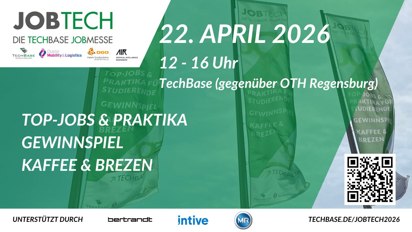 Die JOBTECH ist die ideale Plattform, um Studierende und zukünftige Absolvent:innen mit Unternehmen aus der Region zusammenzubringen. Die JOBTECH wird organisiert vom Cluster Mobility & Logistics in Zusammenarbeit mit der TechBase Regensburg, der Digitalen Gründerinitiative Oberpfalz sowie AIR Artificial Intelligence Regensburg.